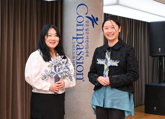 어린이 돕기 나선 종이꽃 작가 나난나난(왼쪽) 작가와 김예지 대표가 19일 서울 용산구 한국컴패션 사옥에서 꽃과 십자가 모양의 작품을 들고 밝게 웃고 있다.