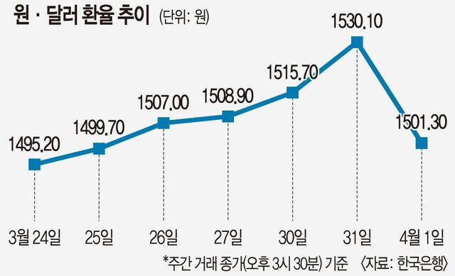 전날 1530원을 넘기며 2009년 글로벌 금융위기 이후 최고 수준까지 치솟았던 환율이 하루 만에 급락한 것이다.
