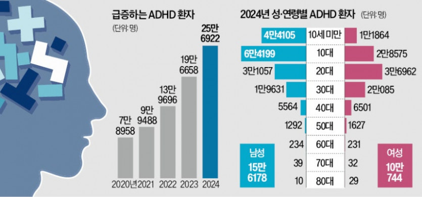 국내에서 ADHD로 진료받은 환자는 2020년 7만8958명에서 2024년 25만6922명으로 5년 새 3.3배 급증했다.